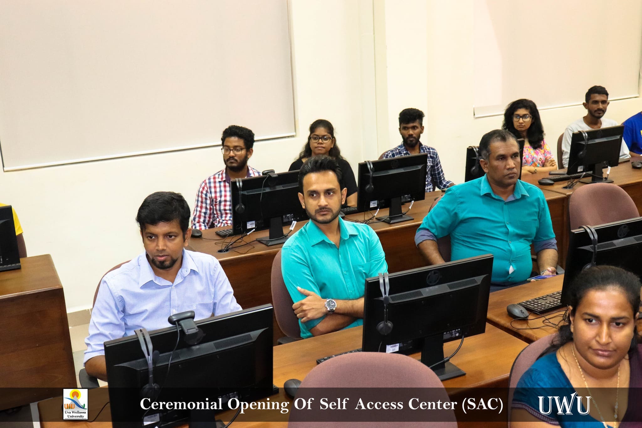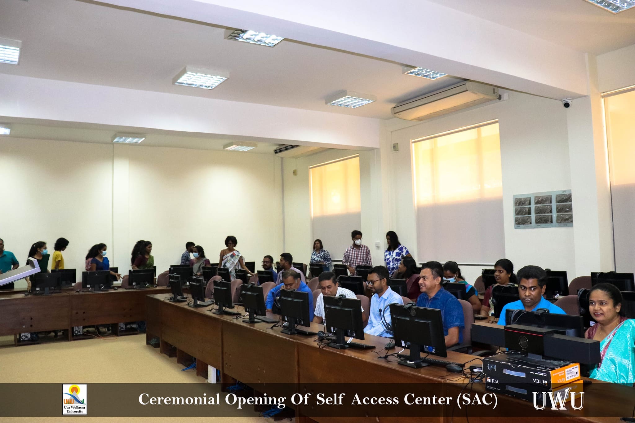 The well-facilitated computer laboratory with 24-hour access for students, called Self-Access Center (SAC), Faculty of the Applied Sciences was ceremonially opened on the November 22, 2022 at the D-Block, Uva Wellassa University of Sri Lanka by participating distinguished invitees, faculty members and students. It has been created for the utilization of the faculty students to carry out their learner-centered activities during any time of the day. SAC is equipped with high tech 70 computers, headsets with mics, cameras, a smart interactive board for video conferencing, fast internet facilities, while providing printer, scanner and copier facilities for students. RFID card will be issued to the students and they have to create an account and top up their accounts by paying to shroff counter. Then by swiping their RFID cards they can take the printouts and the cost will be deducted from their account. In addition to that, there is a lobby area attached to SAC for students to spend the time and relax while having a Nescafe.